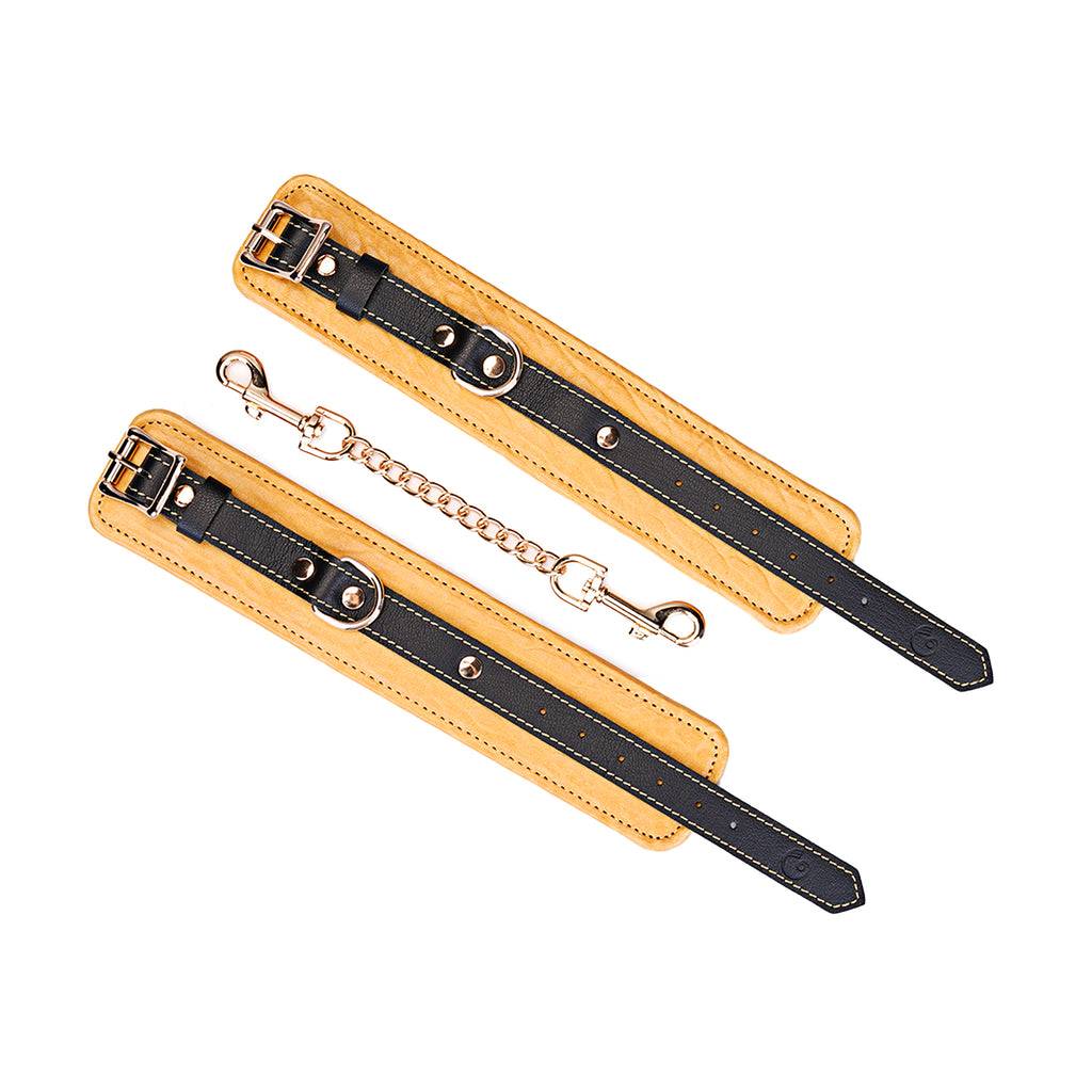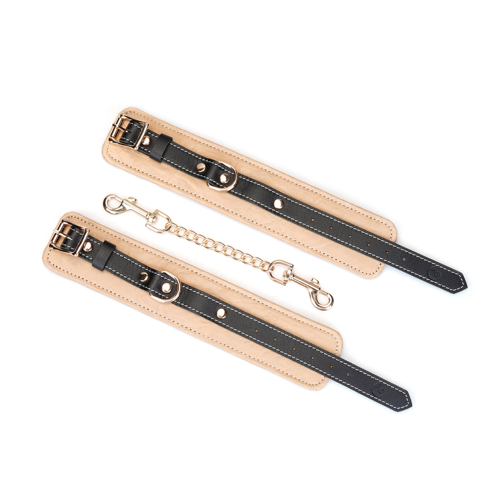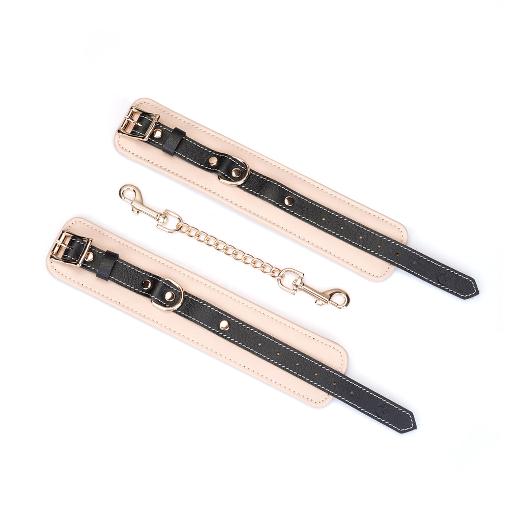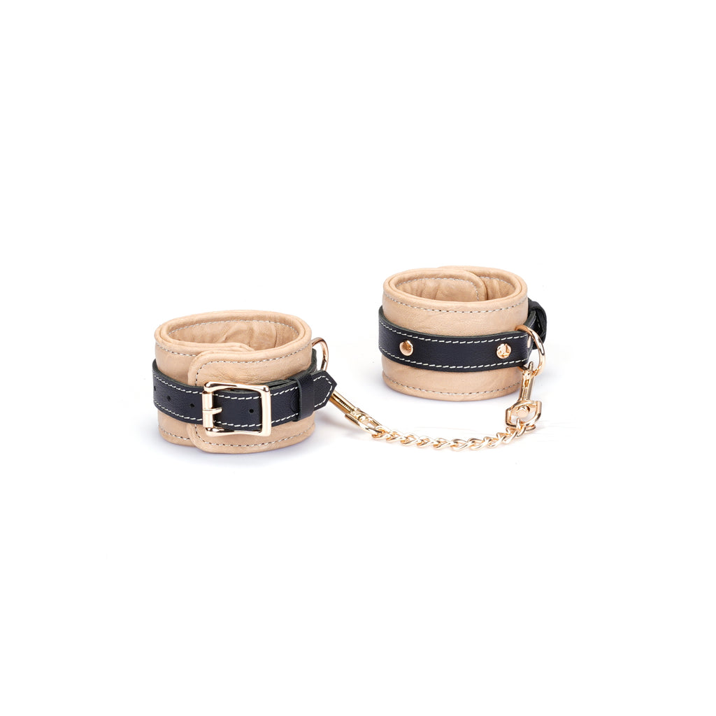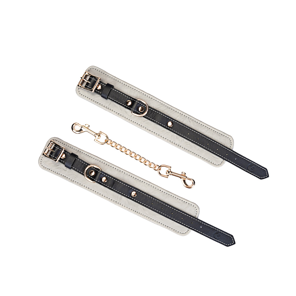 Experience the perfect blend of restraint and refinement with our Adjustable Multi-Leather Cuffs. Expertly crafted for superior comfort and style, each cuff features a supple lambskin leather body, providing a soft feel against the skin. Contrasting black cowskin leather accents add a bold, defining detail to the design, elevating its visual appeal.
