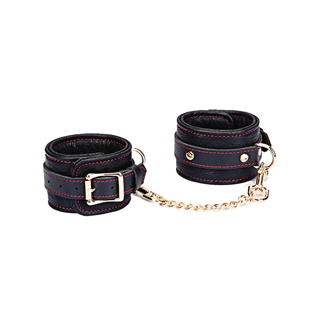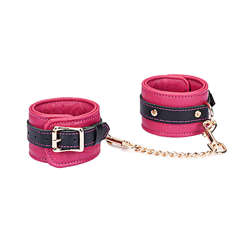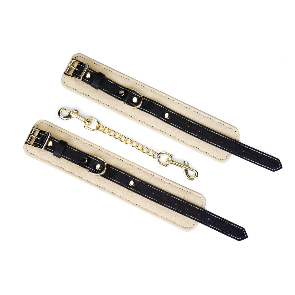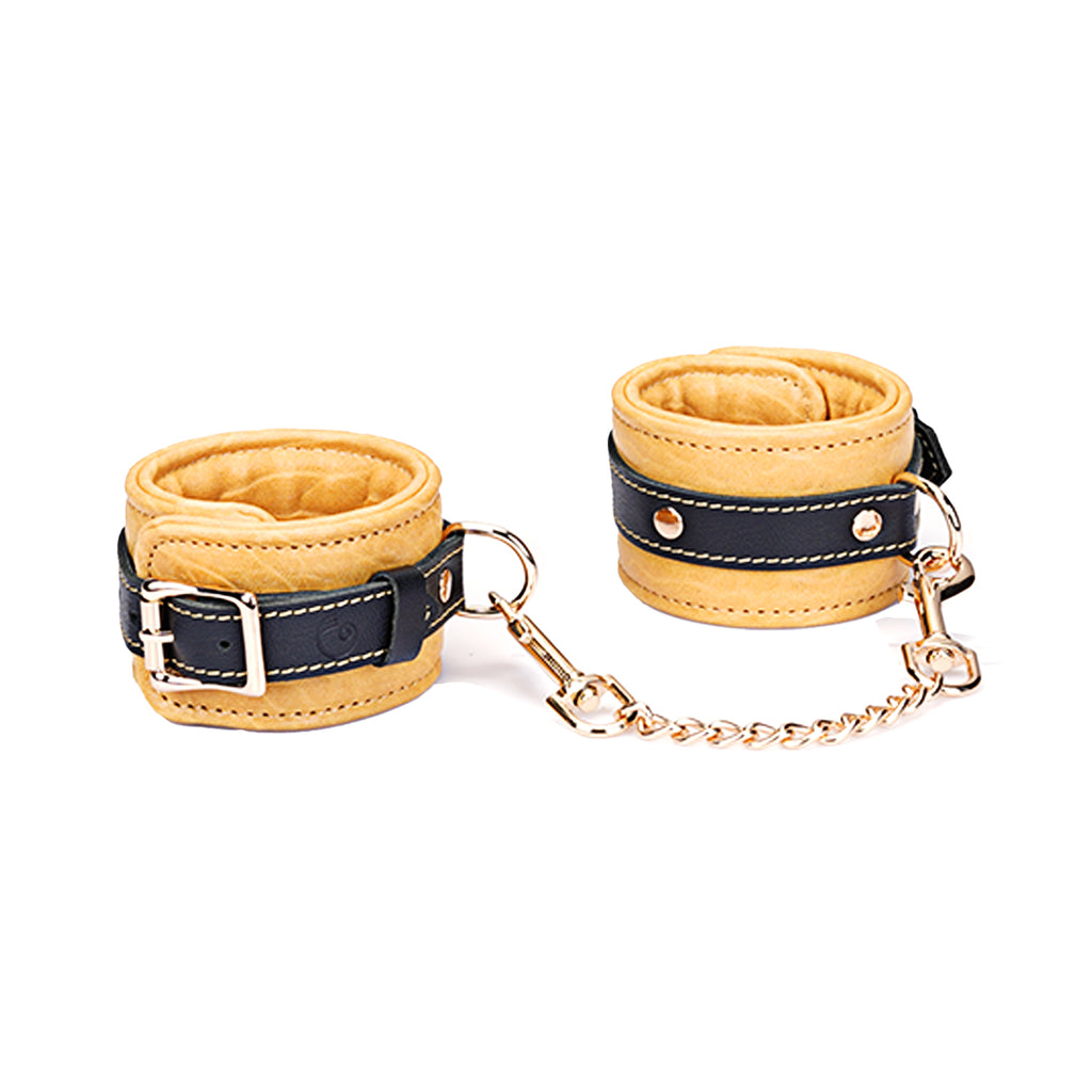 Experience the perfect blend of restraint and refinement with our Adjustable Multi-Leather Cuffs. Expertly crafted for superior comfort and style, each cuff features a supple lambskin leather body, providing a soft feel against the skin. Contrasting black cowskin leather accents add a bold, defining detail to the design, elevating its visual appeal.